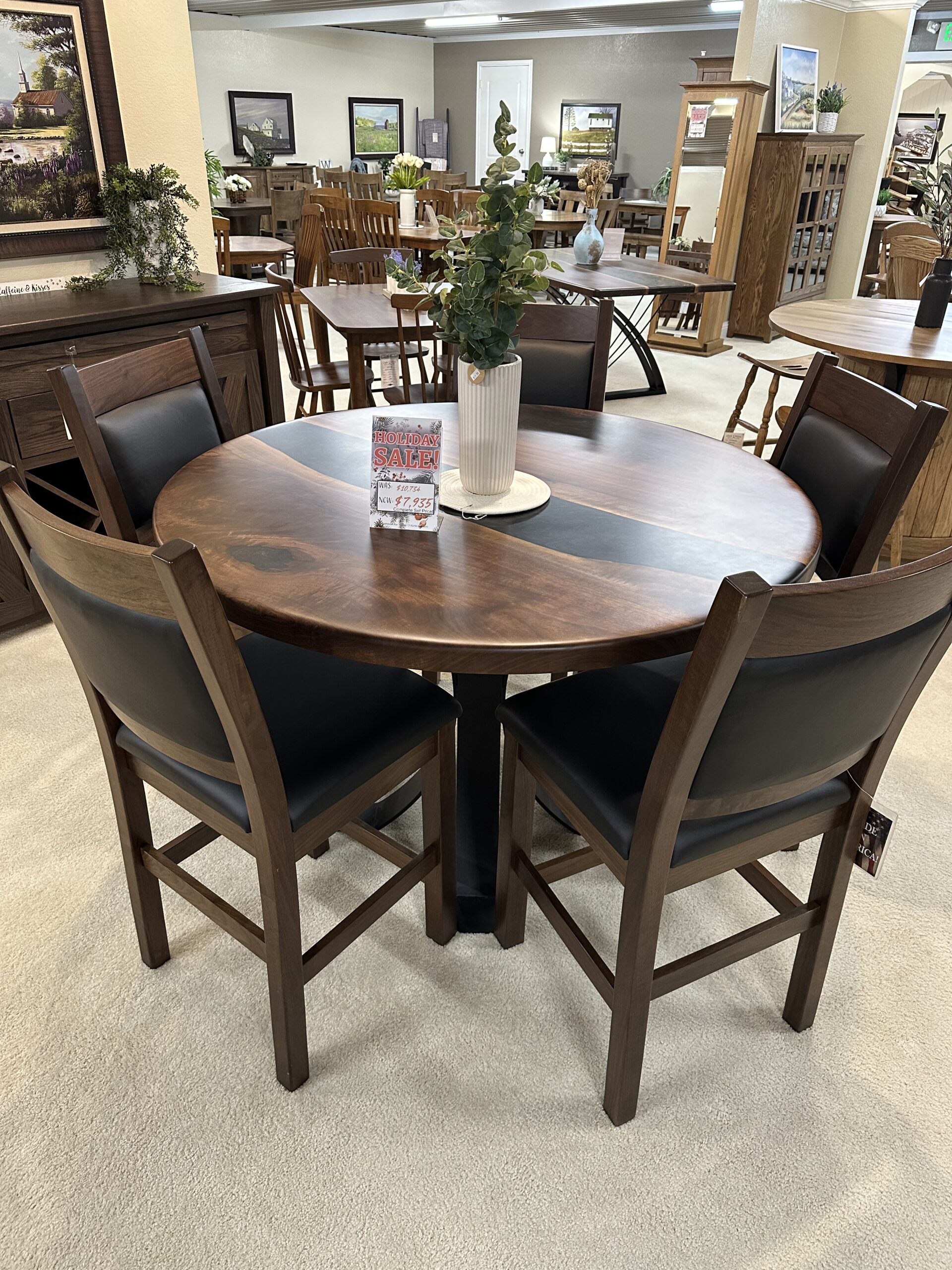 52″ Round Impression Bar Table with Epoxy. 5 Martin Barchairs with Black Leather. Built out of Walnut.